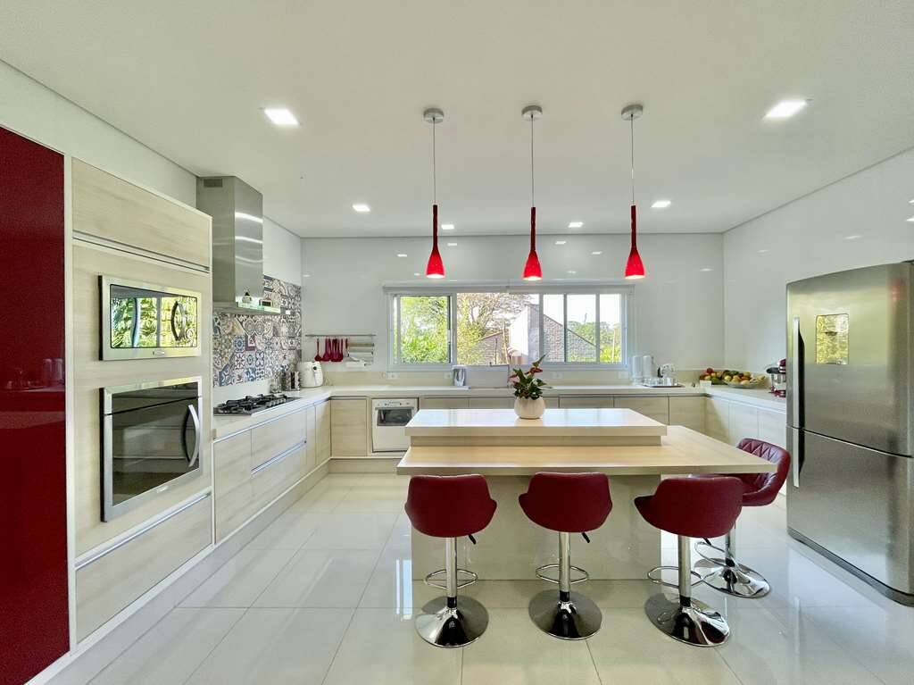 - Cozinha planejada repleta de armários Romanzza, bancada em “U”, tampos em Silestone, ilha com balcão e 2 cubas inox.