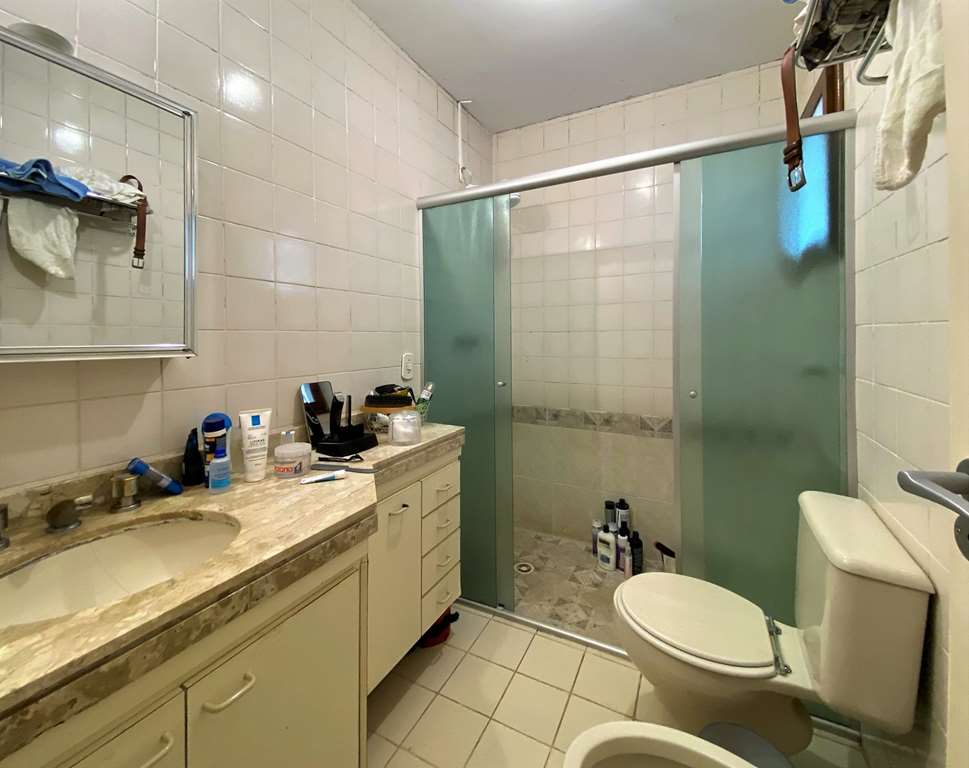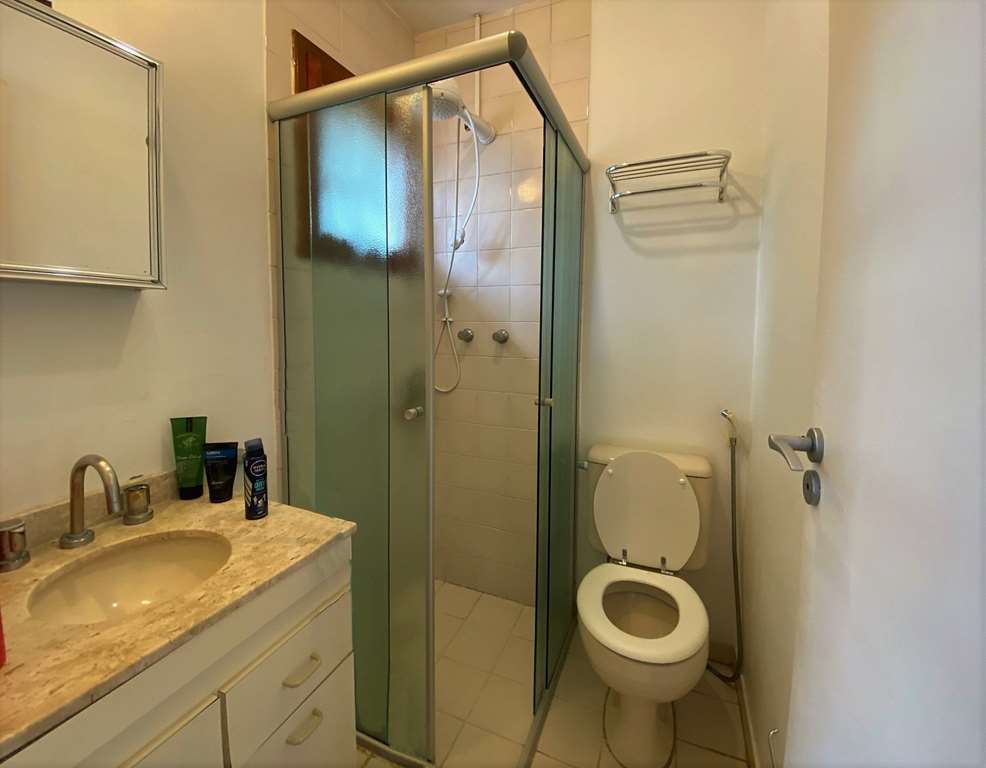 - Banheiros com bancada, pia, espelho, gabinetes, bidê e box de vidro. Sendo a máster com tampo em mármore travertino.