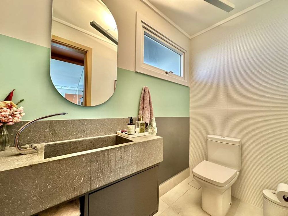 - Banheiros com tampos em resina, espelho, gabinetes box de vidro e nichos. Sendo a master com 2 cubas, 2 duchas e 2 nichos.