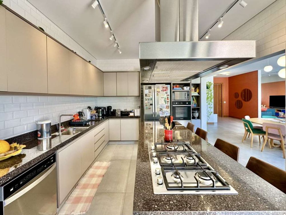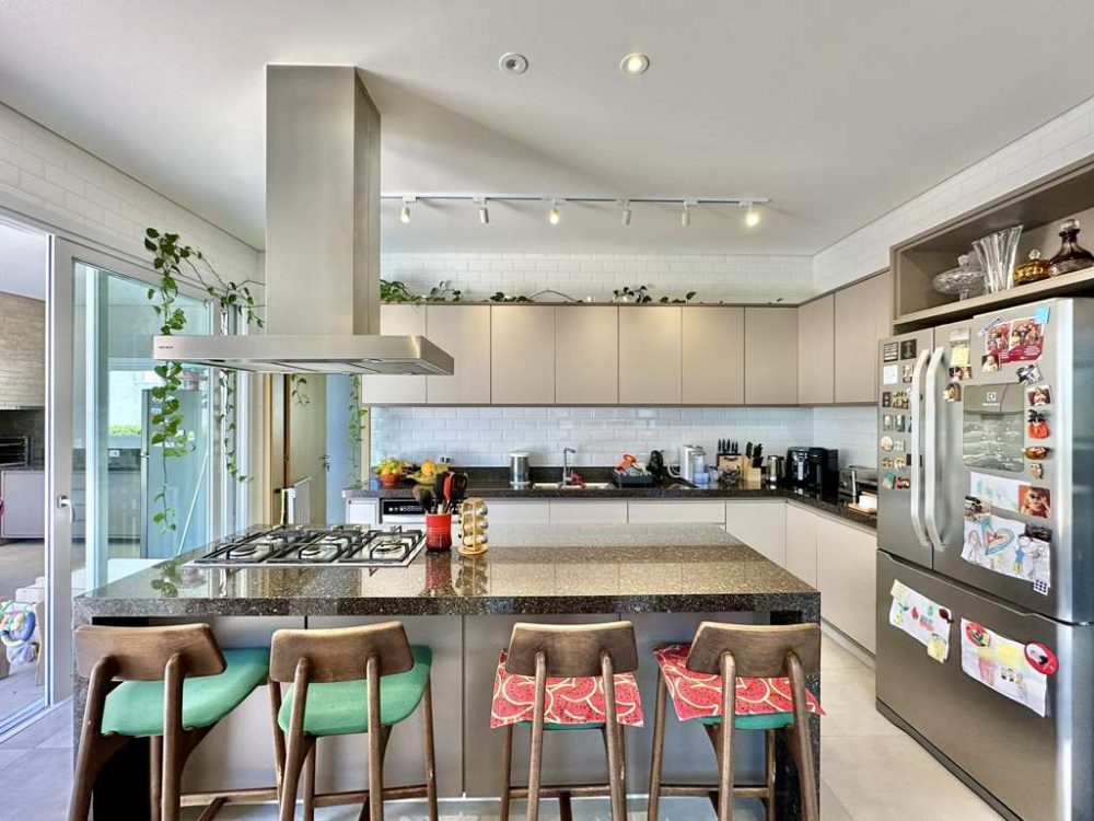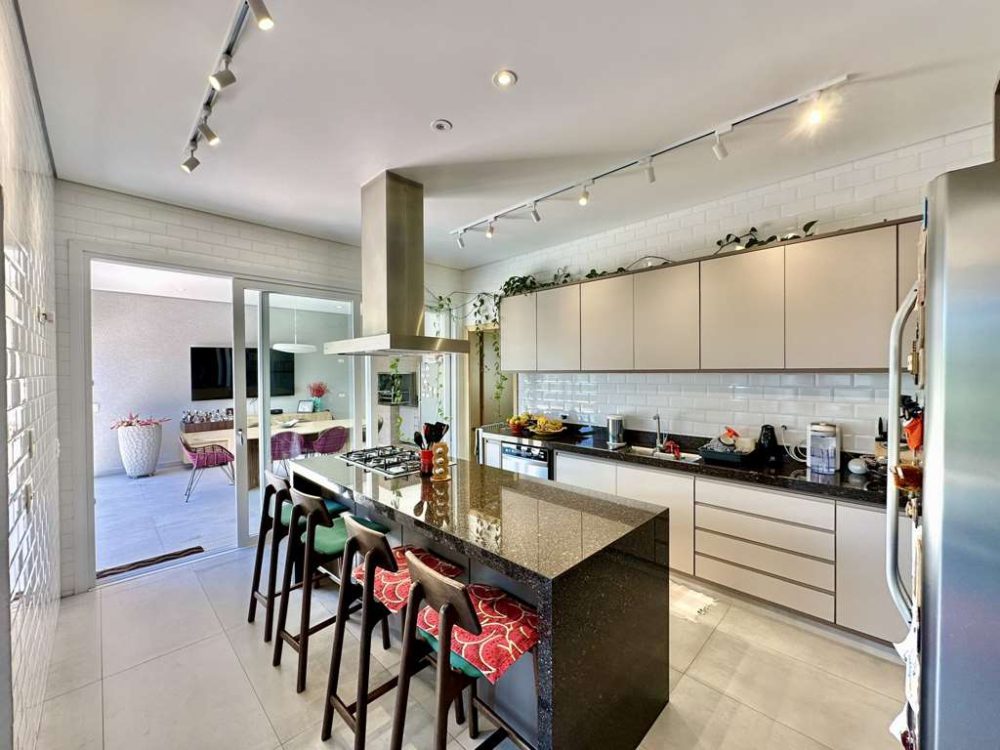 - Cozinha planejada repleta de armários e gabinetes, tampos em granito, cuba inox, torneira gourmet, ilha, coifa inox, fogão 5 bocas Brastemp coocktop e forno Brastemp Gourmann.
