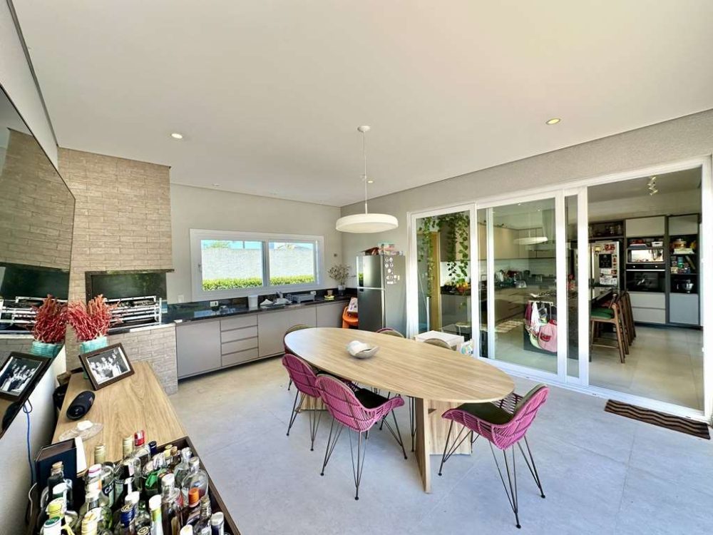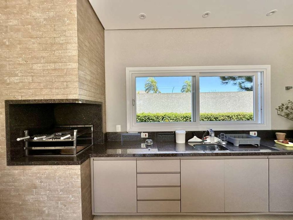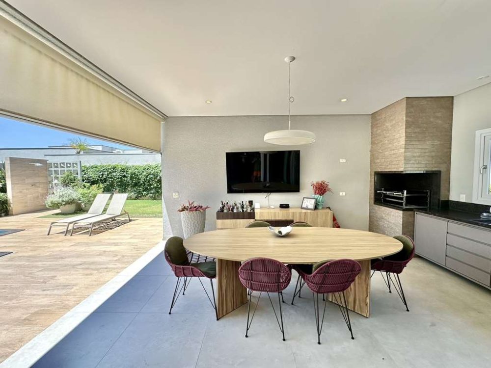 - Varanda gourmet com sala de almoço, TV, bar, churrasqueira com bancada, gabinetes e pia inox.