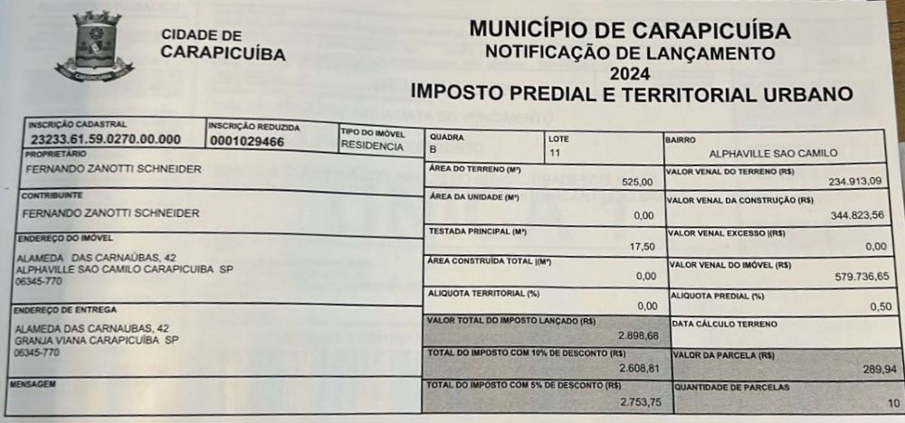 - Valor do IPTU 2025: R$ 2.726,21 ano à vista ou 10 x de R$ 302,93 (R$ 12 x 227,18)