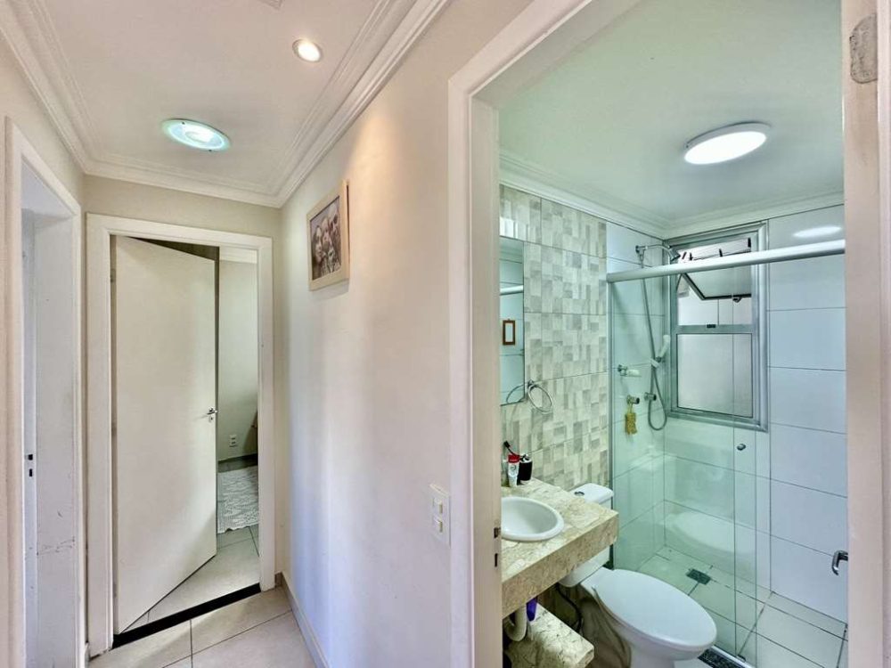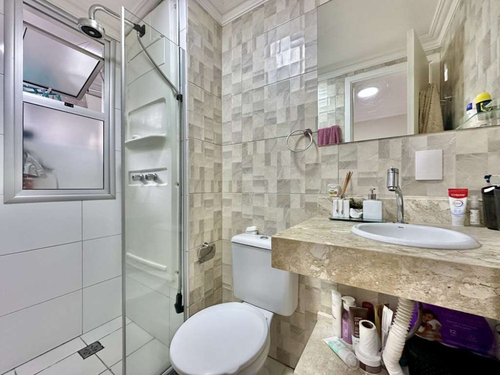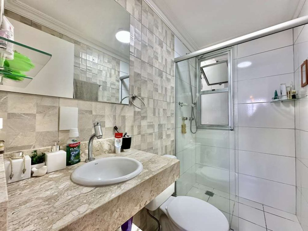 - Banheiros com tampo em mármore e box de vidro.