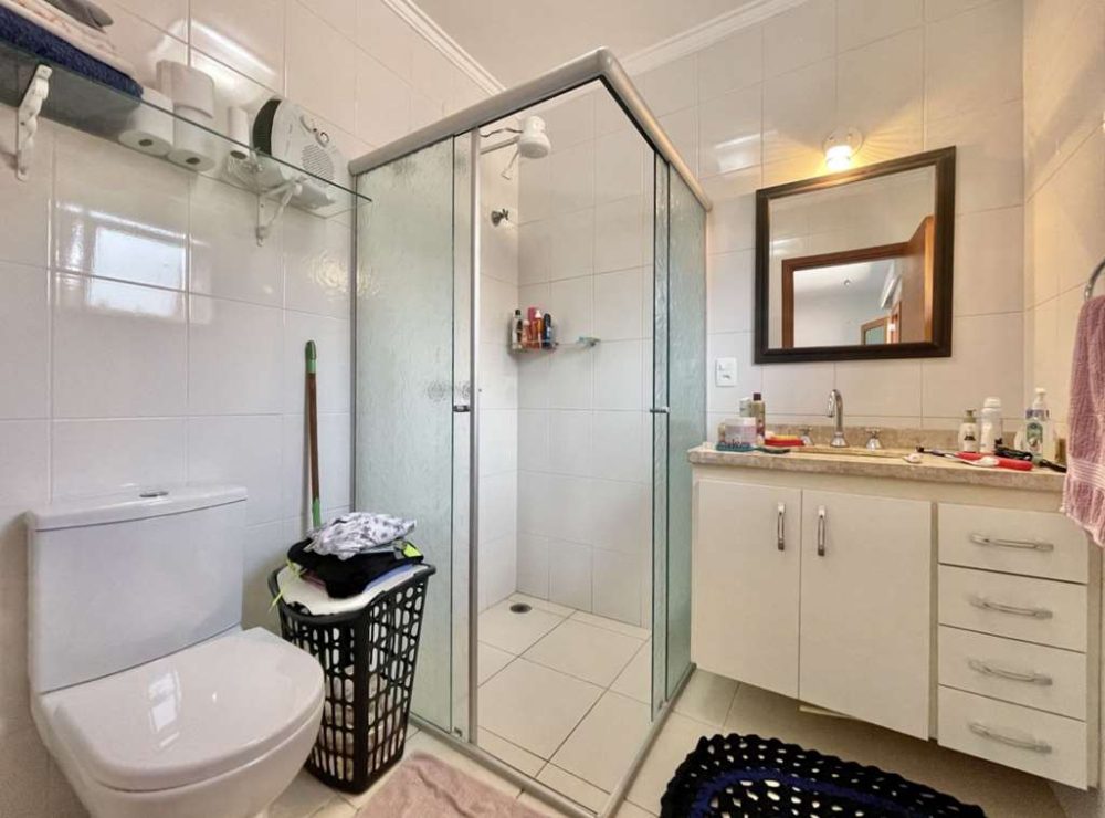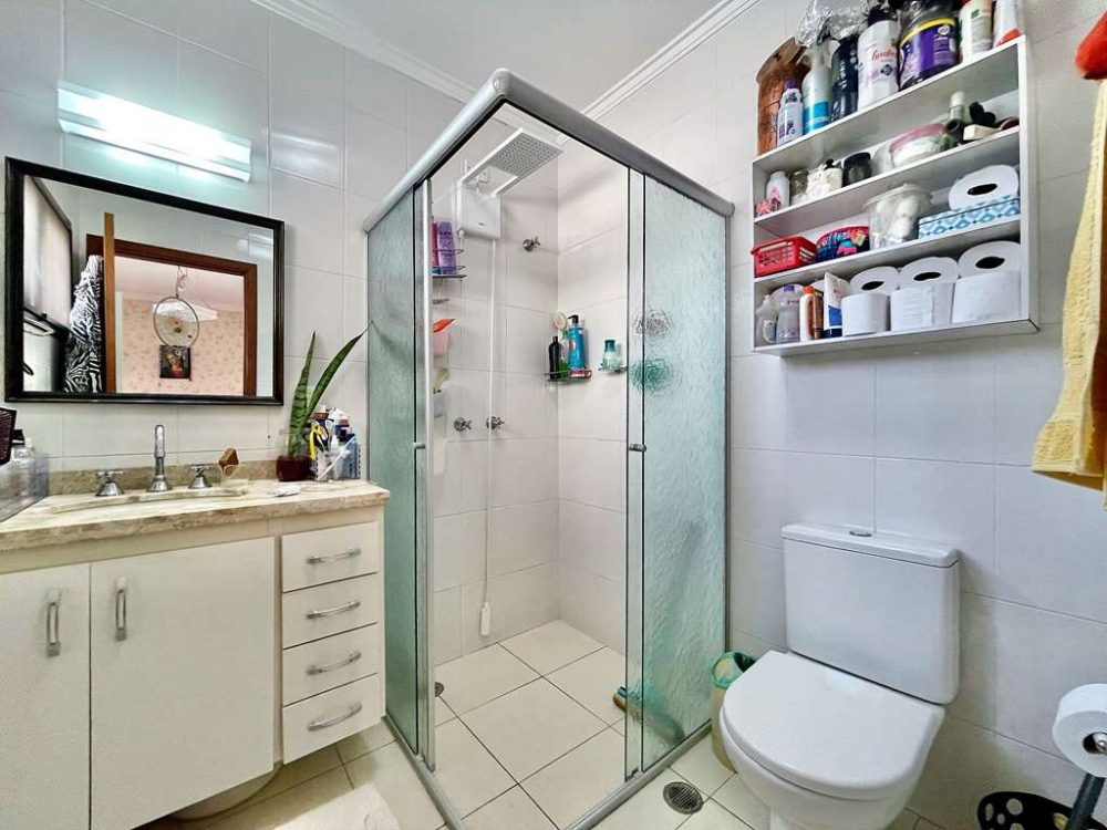 - Banheiros com tampo em mármore Travertino, espelho, gabinetes e box de vidro.