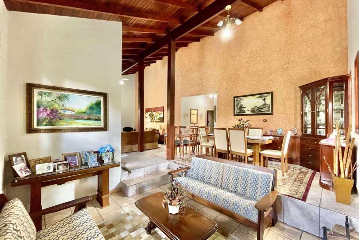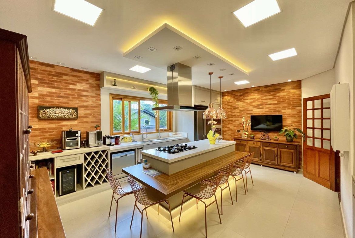 - Living para 5 ambientes: Estar, TV, lareira em desnível, jantar e bar.