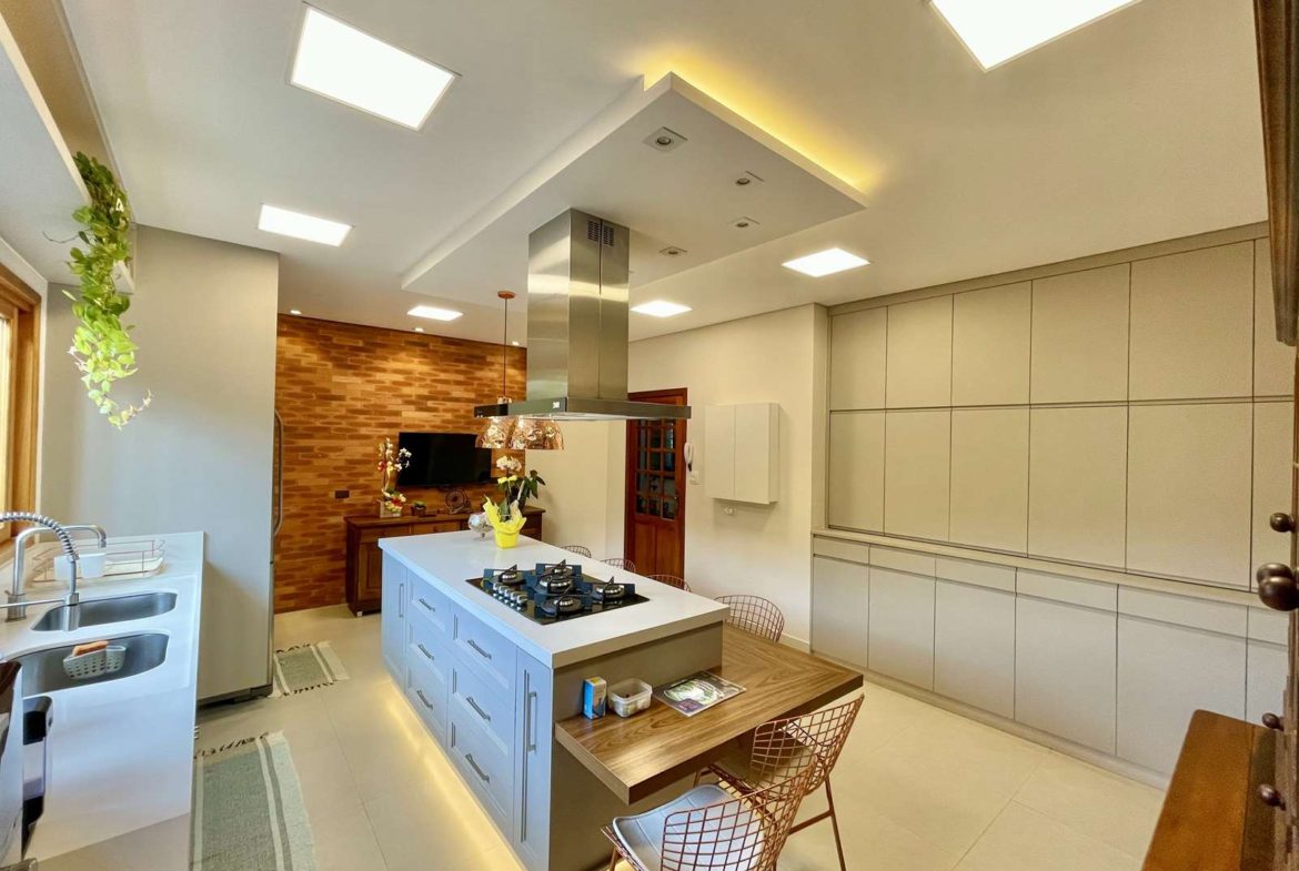 - Cozinha totalmente modernizada, repleta de armários planejados , portas e gavetas com amortecedores, tampos em pedra branco absoluto, 2 cubas inox, ilha com balcão para 6 pessoas, micro ondas e forno à gás Electrolux.