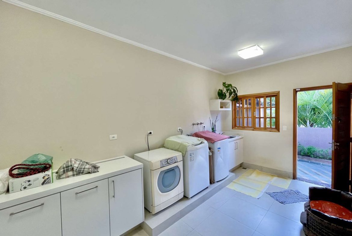 - Área de serviço aberta ensolarada e lavanderia fechada com tanque inox, armários.