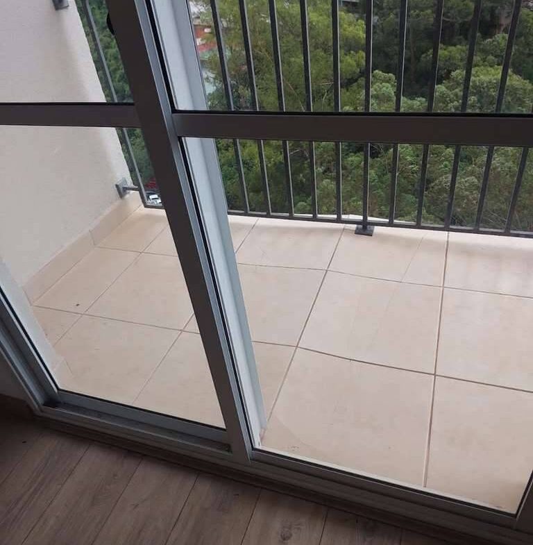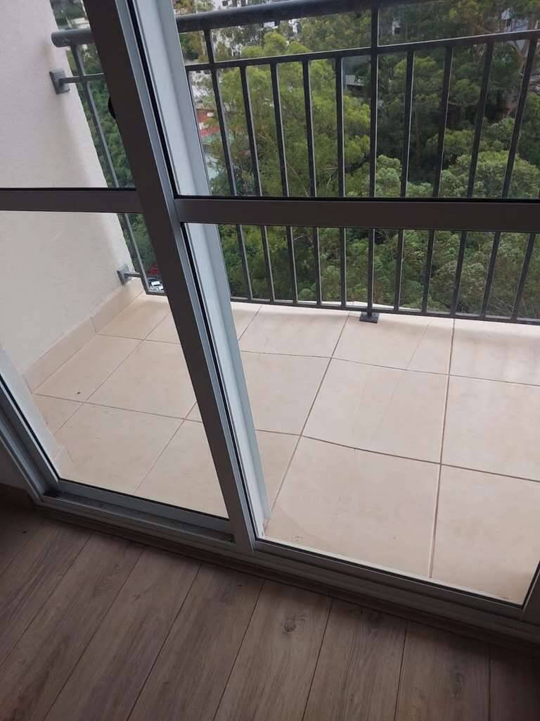 - Living para 3 ambientes integrados à cozinha, voltado para varanda com guarda corpo de metal e vista.