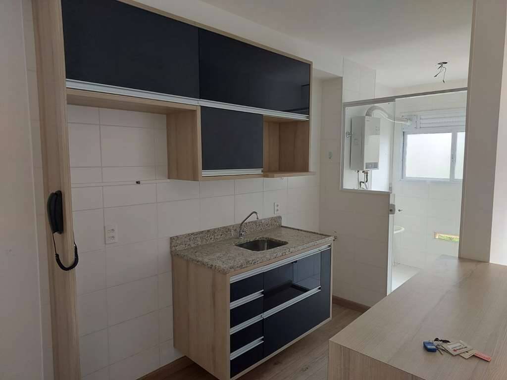 - Cozinha planejada com armários, gabinete e balcão, bancada em granito e cuba inox.