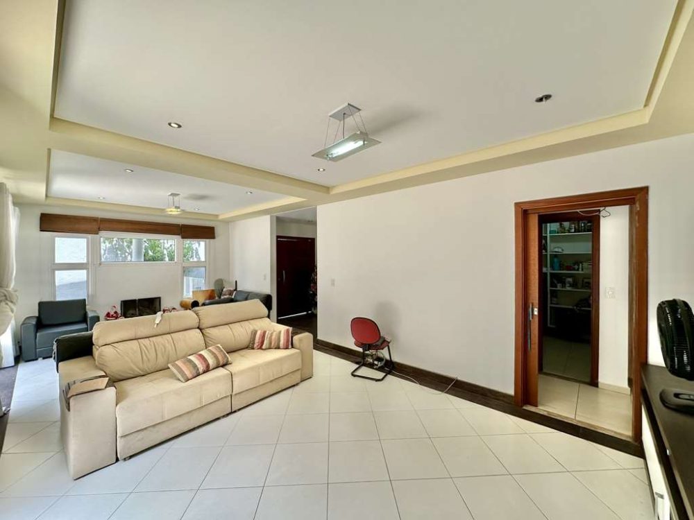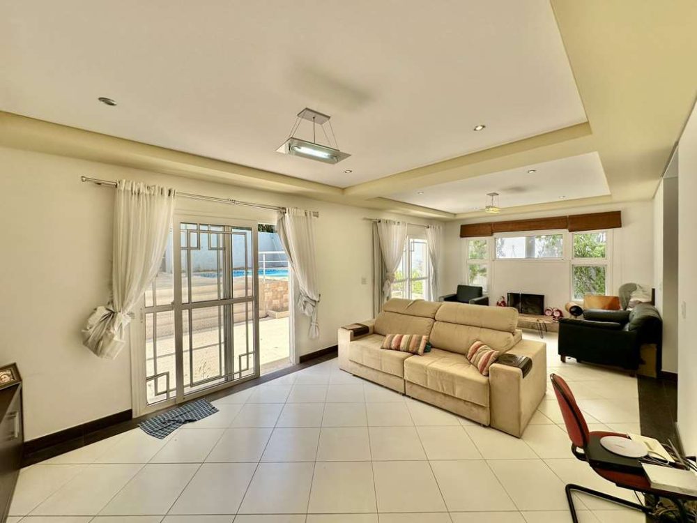 - Living para 3 ambientes, estar, lareira e TV, integrado à edícula por cobertura de policarbonato.