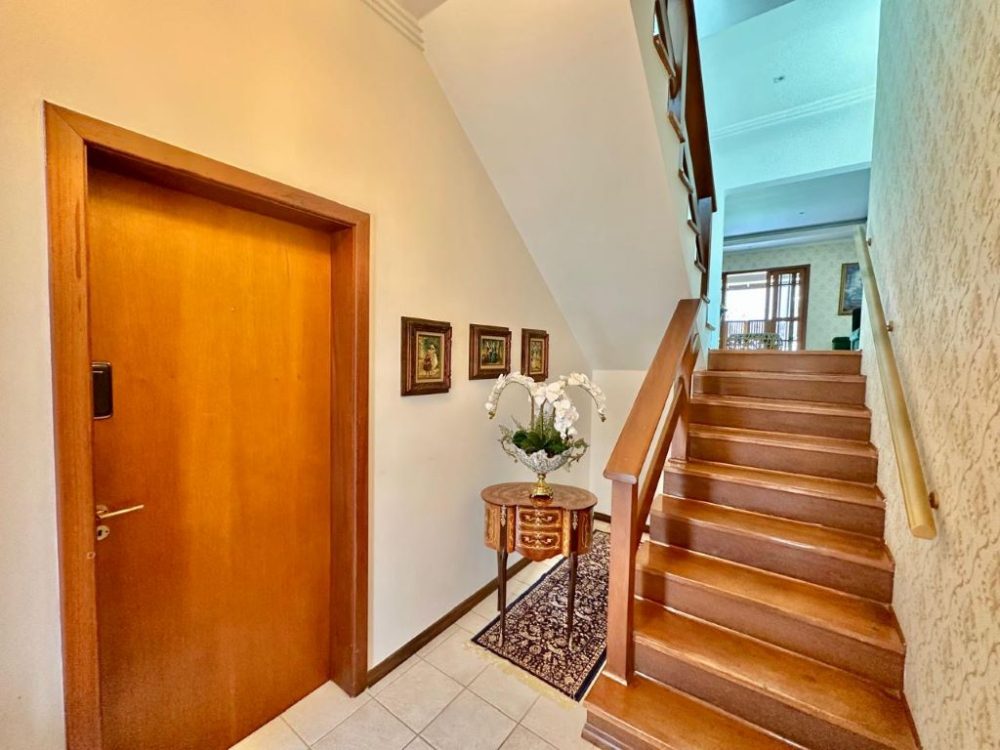 - Escada de alvenaria revestida em madeira com guarda corpo de madeira.