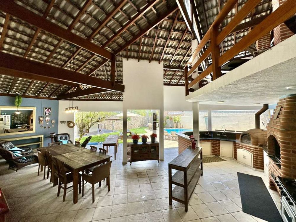 - Área gourmet com balcão, tampo em granito, cuba inox, forno e fogão à lenha, forno de pizza, churrasqueira e gabinetes.