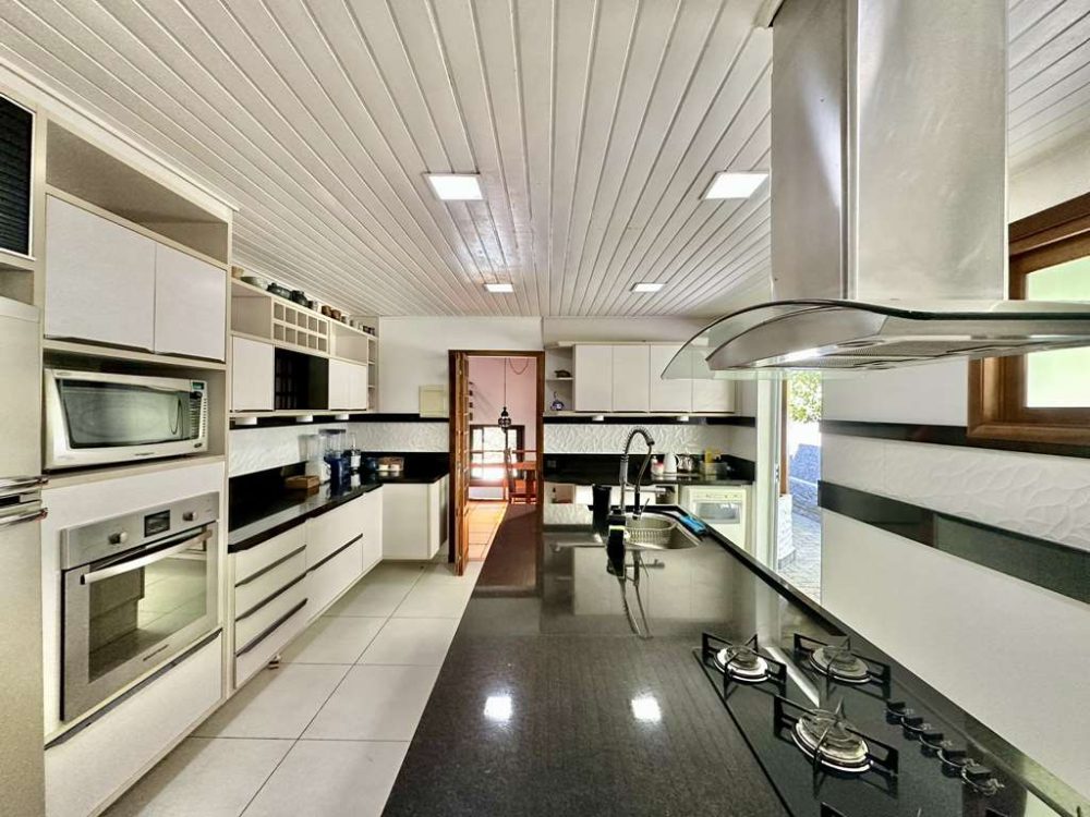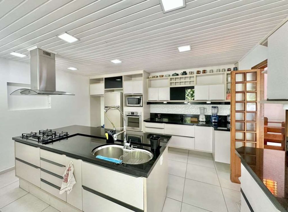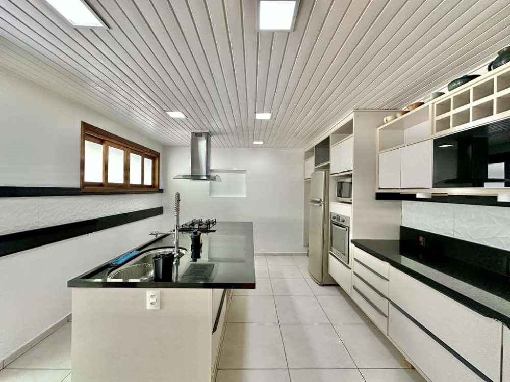 • Copa cozinha modernizada e planejada, integrada à sala de jantar, repleta de armários e gabinetes, com bancadas em granito, 2 cubas inox, torneira gourmet, ilha com coifa inox, com porta de vidro para o quintal.