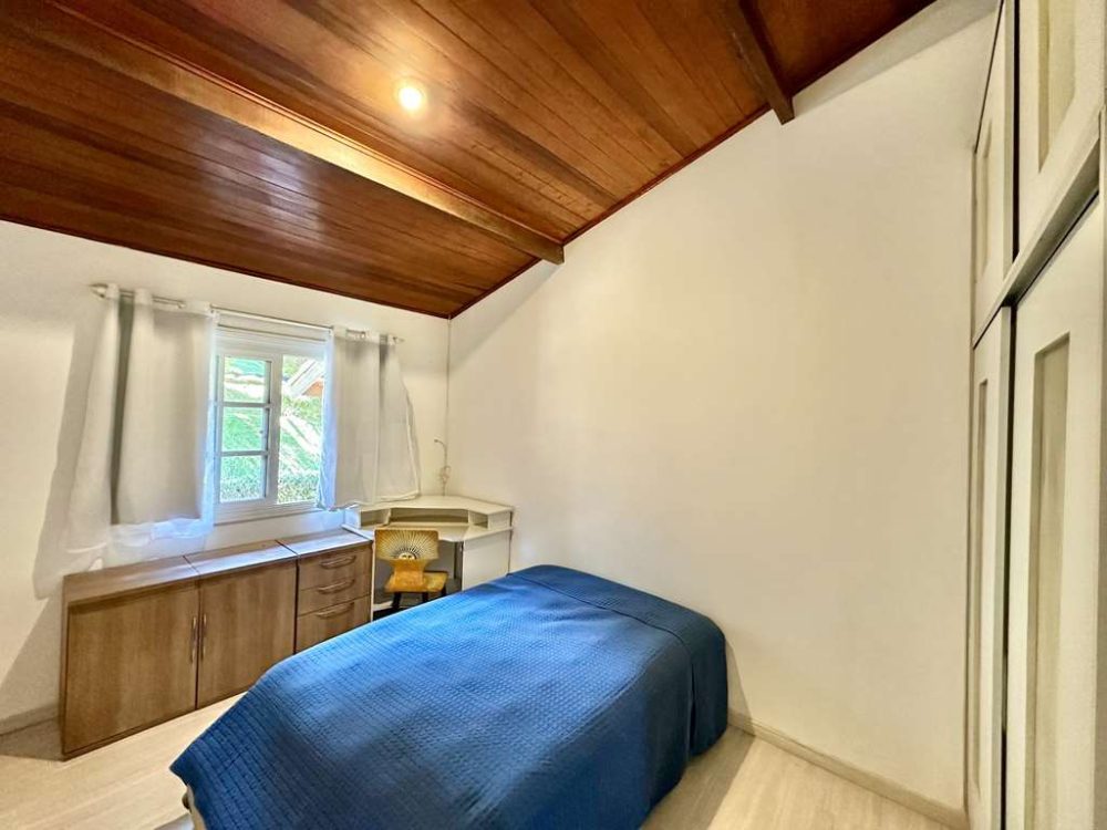• Suíte de serviço com acesso externo piso em cerâmica portas e janelas em madeira e vidro com veneziana no quarto.