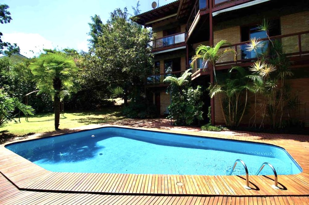 - Piscina de alvenaria revestida com pastilhas de cerâmica, iluminada, deck em Ipê, solarium, ducha e casa de máquinas.