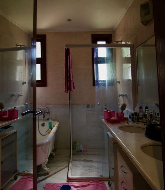 - Banheiros com pisos e tampos em mármore, espelhos e box de vidro, sendo a master com 2 cubas e hidro.
