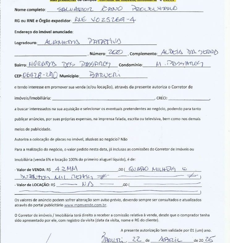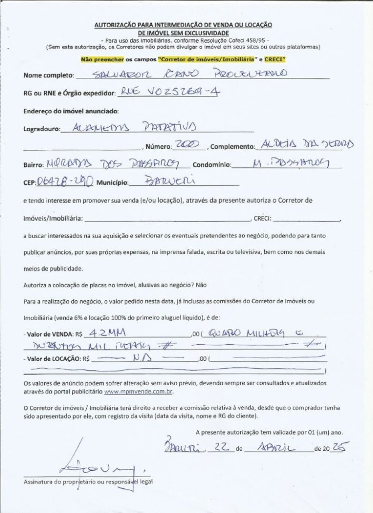 - Endereço do imóvel: Alameda Patativa, 200 – Condomínio Morada dos Pássaros (Bairro postal: Residencial Morada dos Pássaros-Aldeia da Serra) – Barueri, SP – CEP: 06428-290