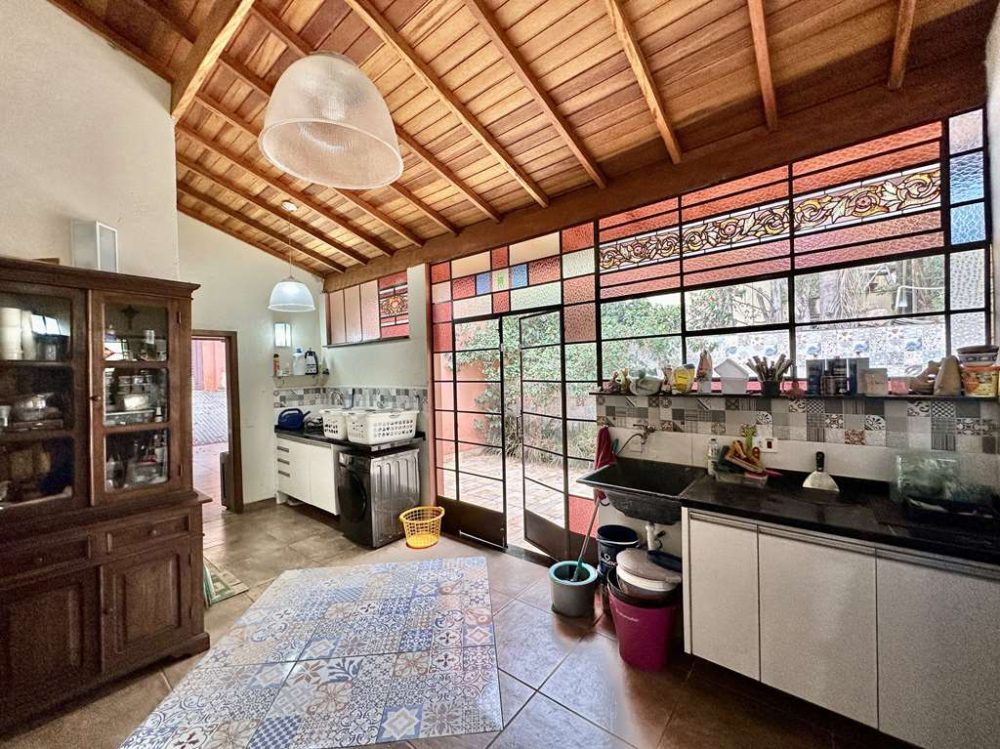 - Área de serviço aberta ensolarada e lavanderia fechada ampla, com bancada em granito, pia inox, gabinetes e tanque.