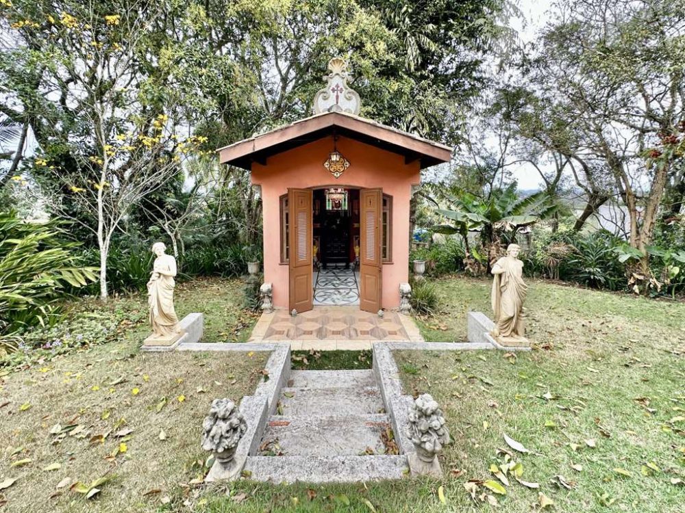 - Capela decorada com vitrais, lustre de cristal e piso em porcelanato.