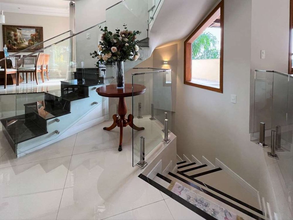 - Escada de alvenaria, revestida em mármore, com guarda corpo de vidro e metal.
