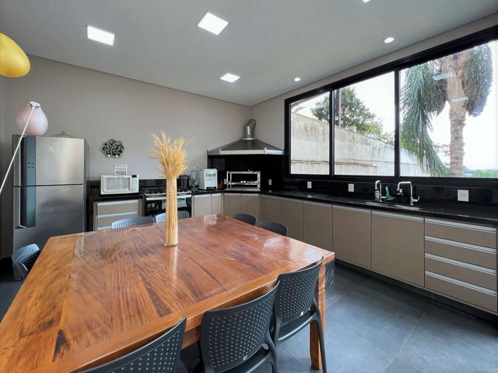 - Salão gourmet com churrasqueira, coifa Inox, bancada em “L” revestida em granito, 2 cubas e gabinetes, alé de fogão e geladeira (será vendido montado, do jeito que está).