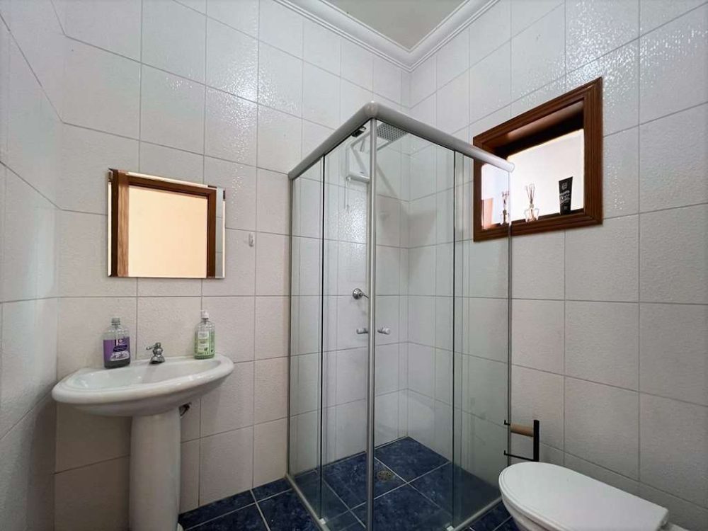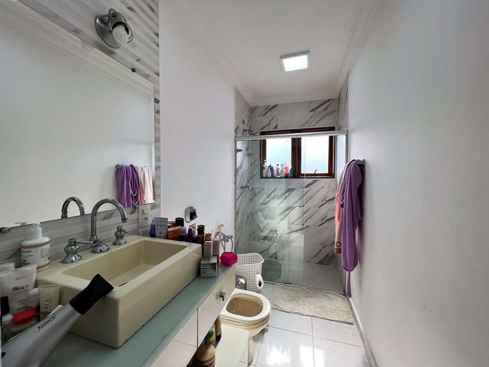 - Banheiros com espelho, gabinetes e box de vidro. Sendo a máster com 2 cubas, bancada em mármore Travertino e hidro dupla.