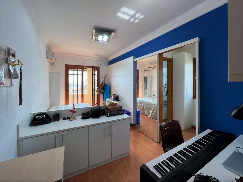 - Family room na parte superior. Ideal para TV e Home Theater, com banheiro completo, espelho, box de vidro e gabinetes.