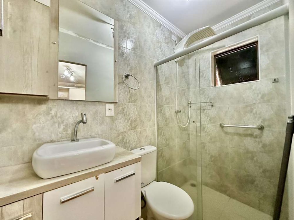 • Banheiro com espelho gabinetes, box de vidro, chuveiro elétrico.