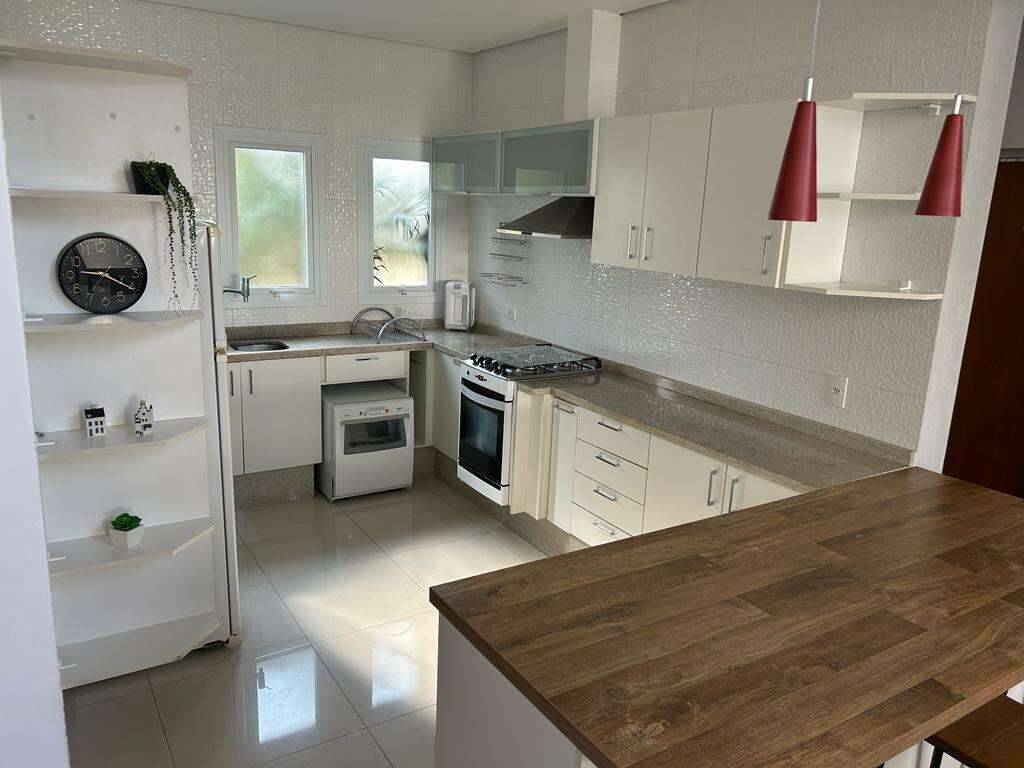 • Cozinha integrada, mobiliada com balcão e fogão embutido.