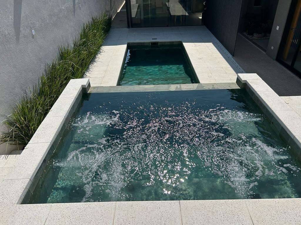 • Piscina aquecida (solar e trocador de calor). Deck molhado, prainha, e Spa com cascata. Revestida em pedra Vulcânica Hijau, borda e piso atérmico Castelatto.