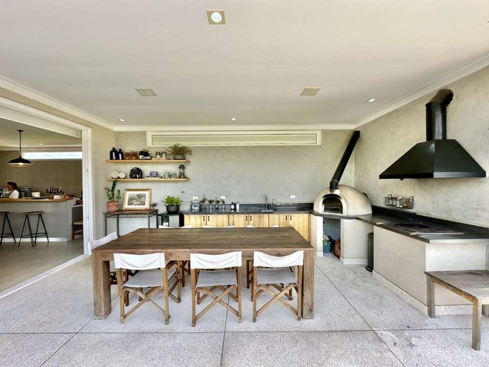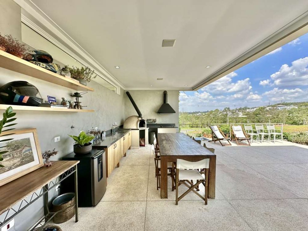 • Varanda gourmet com vista, churrasqueira, forno de pizza, bancada, pia inox e gabinetes.