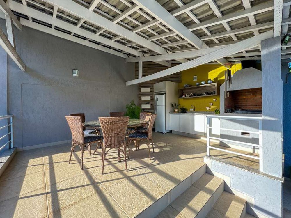 - Espaço gourmet com churrasqueira, pia e área coberta para mesas.
