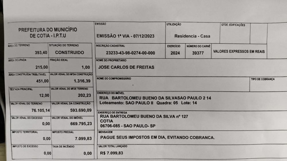 - Valor do IPTU (2024): R$ 6.389,84 ano ou 12 x de R$ 546,14