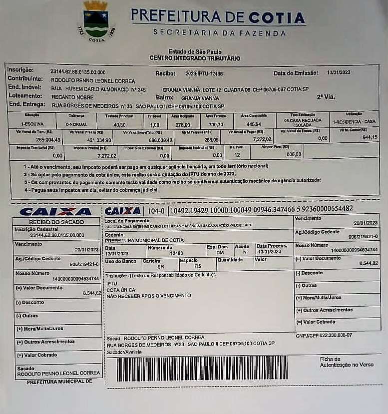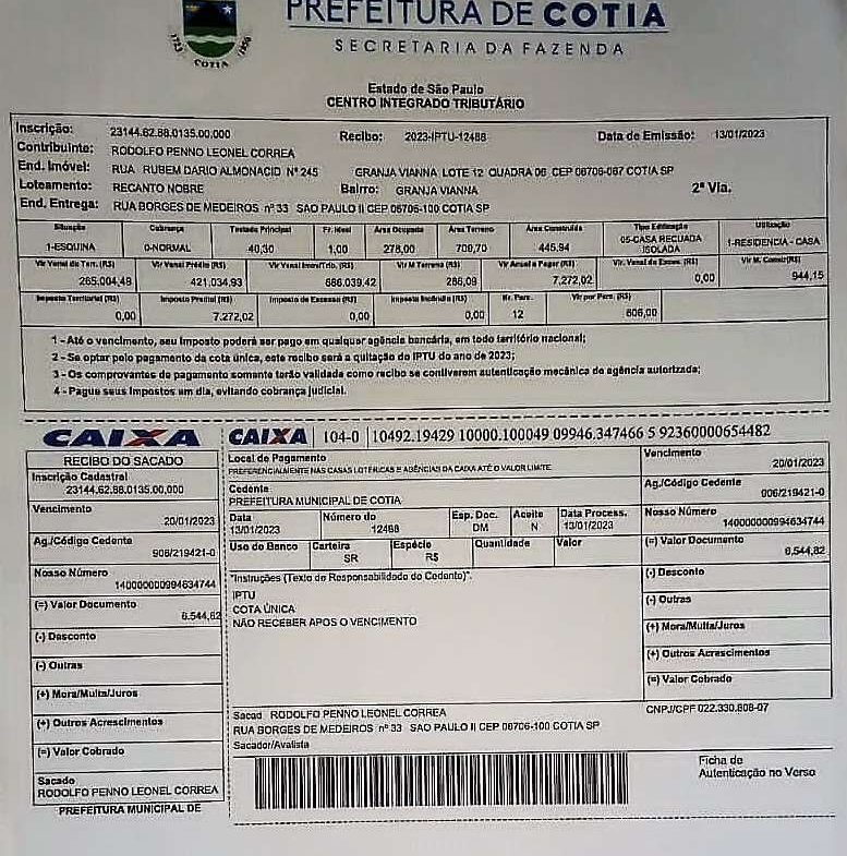 Inscrição Cadastral: 23144.62.88.0135.00.000 / Cotia