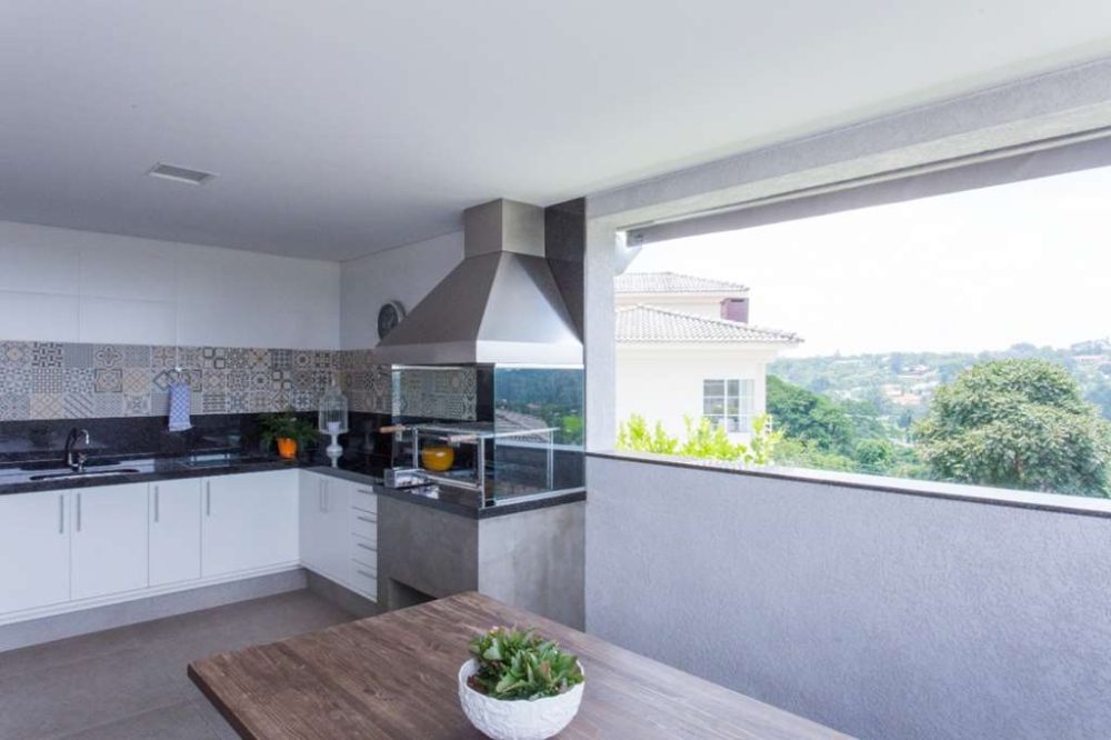 - Espaço gourmet integrado a piscina e a cozinha, com enorme bancada toda em granito e pia, churrasqueira a carvão com rotação dos espetos elétrica