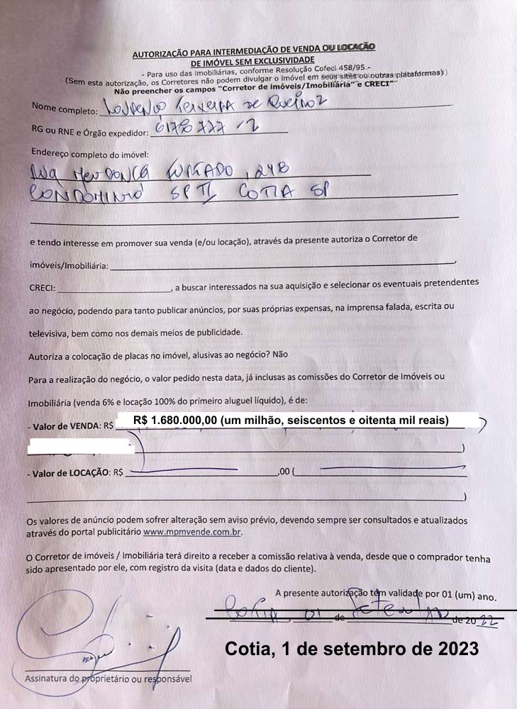 - Endereço do imóvel: Rua Mendonça Furtado, 248 – Cond. São Paulo II (Bairro postal: São Paulo II), Cotia, SP – CEP: 06706-135