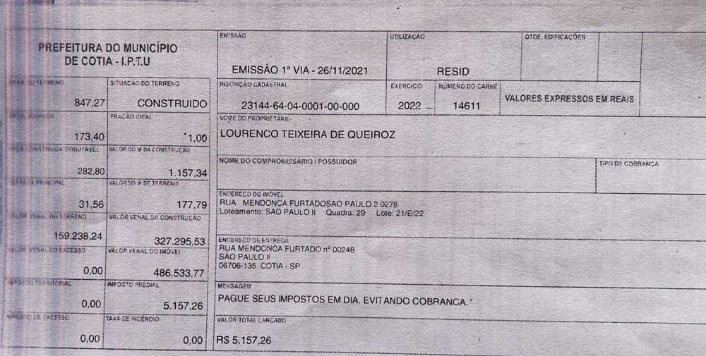 Inscrição Cadastral: 23144.64.04.0001.00.000 / Cotia