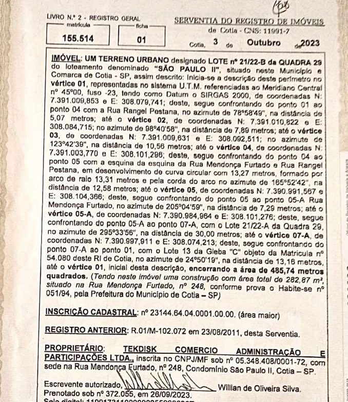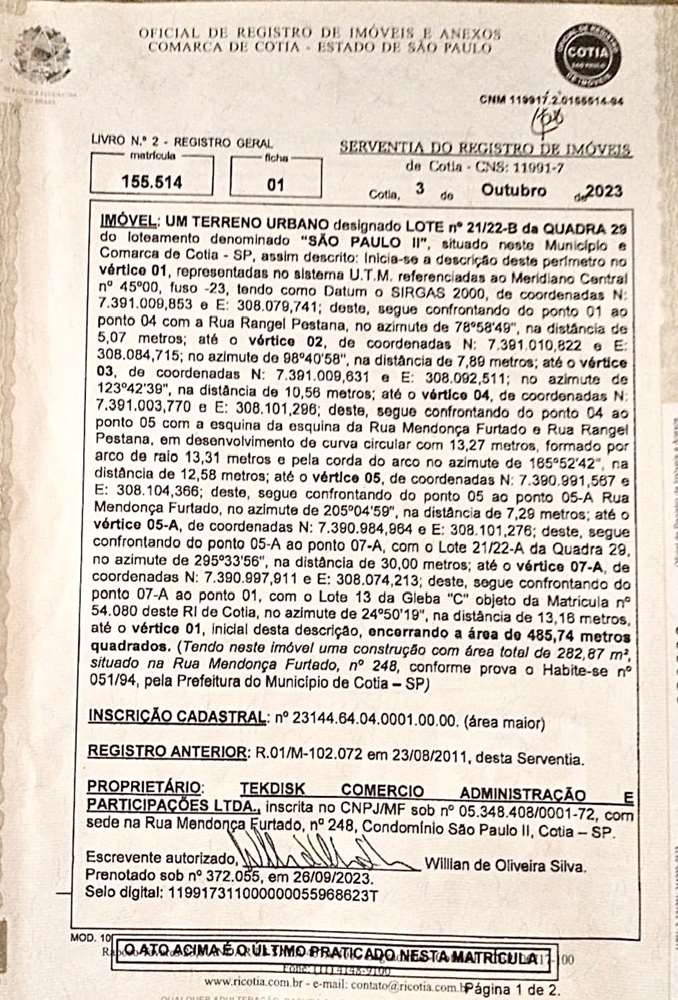 Nº Matrícula: 155.514 – R.I. Cotia (nova Matrícula – Out/23)