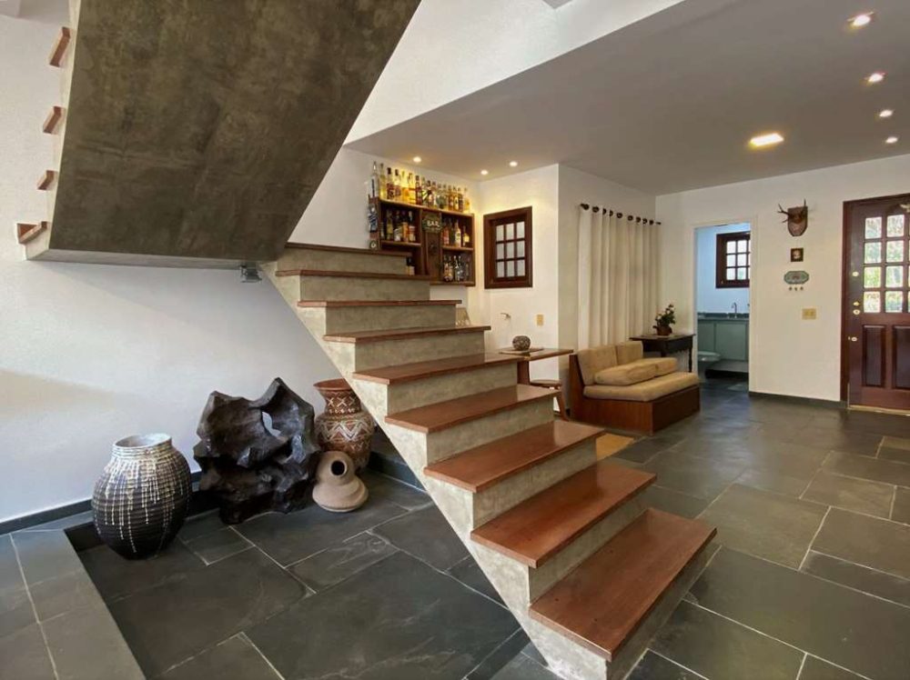 - Salas de estar, TV, jantar, bar e lareira em desnível com pé direito alto.