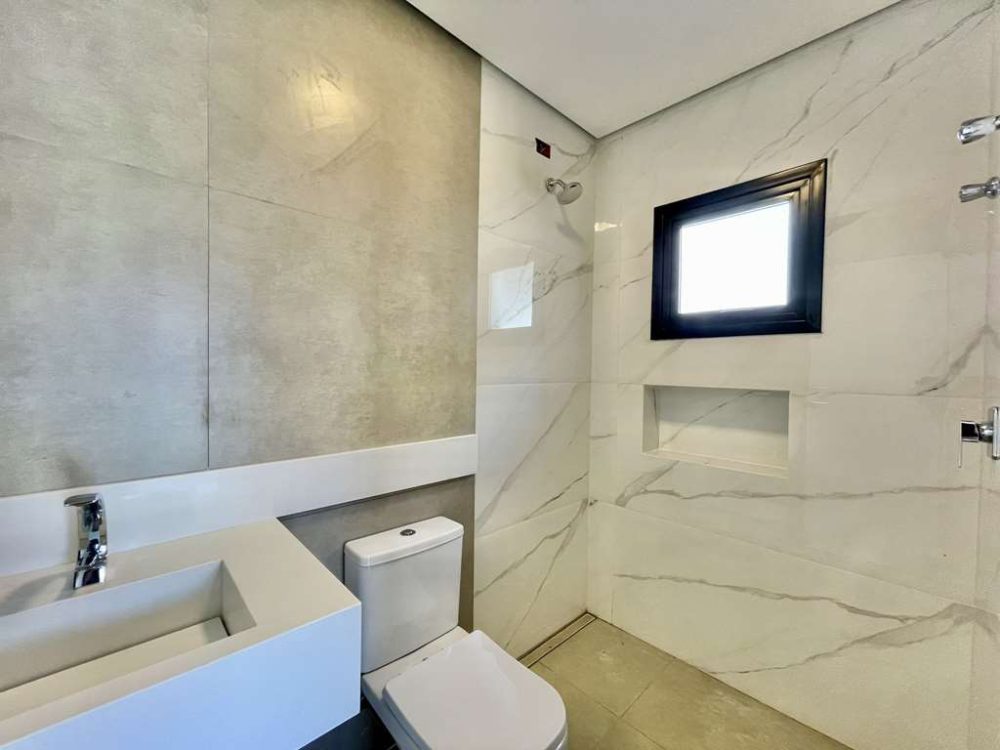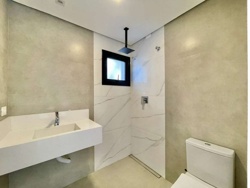 - Banheiros com torneiras mono comando, tampos em resina, chuveiros de teto, nichos e ralos horizontais, móveis planejados e box de vidro.