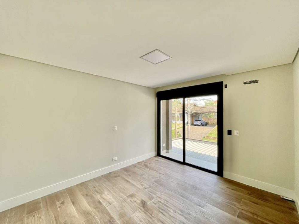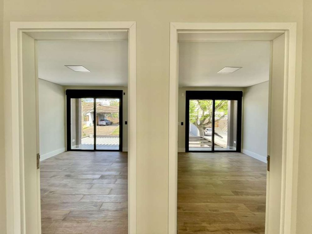 - Portas e janelas em alumínio preto e vidro com persianas elétricas nos quartos.