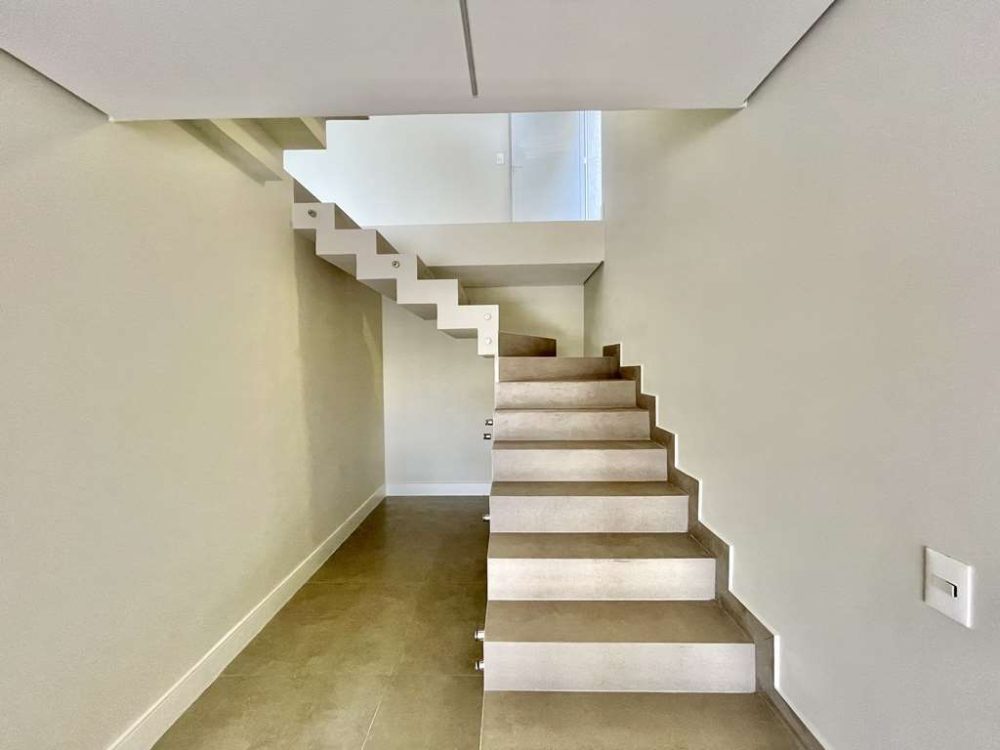 - Escadas de alvenaria revestidas em porcelanato, com guarda corpo de vidro.