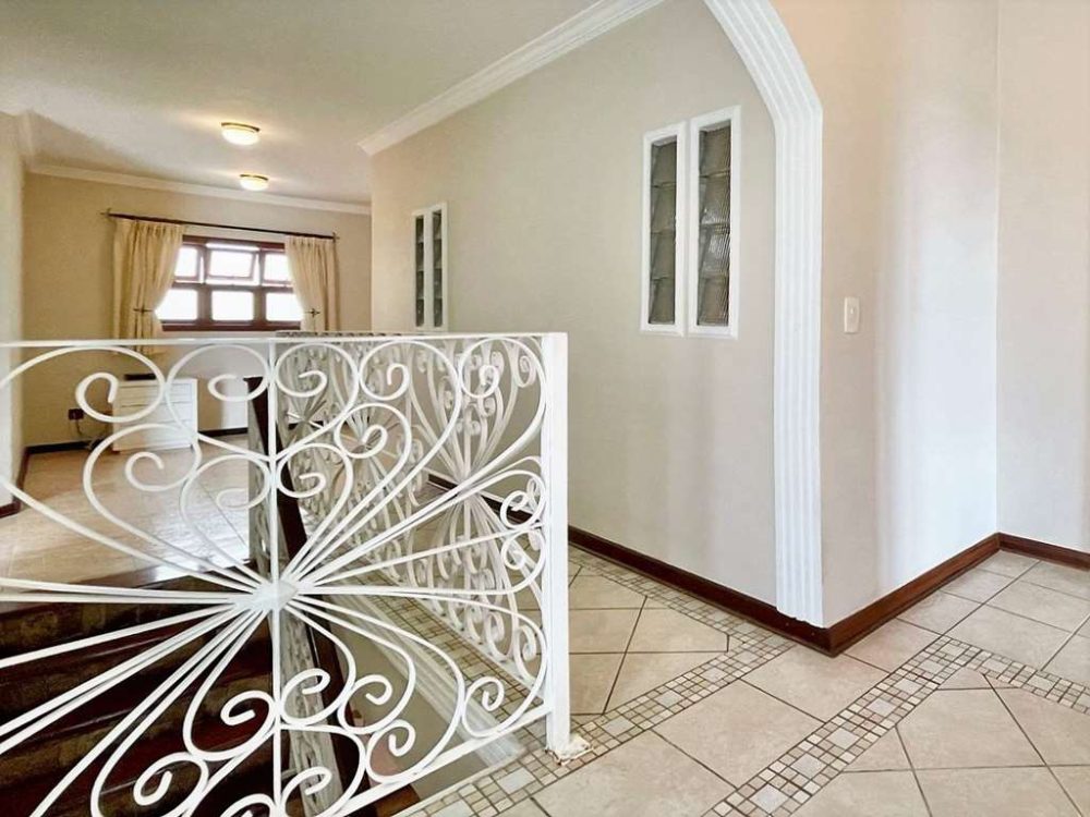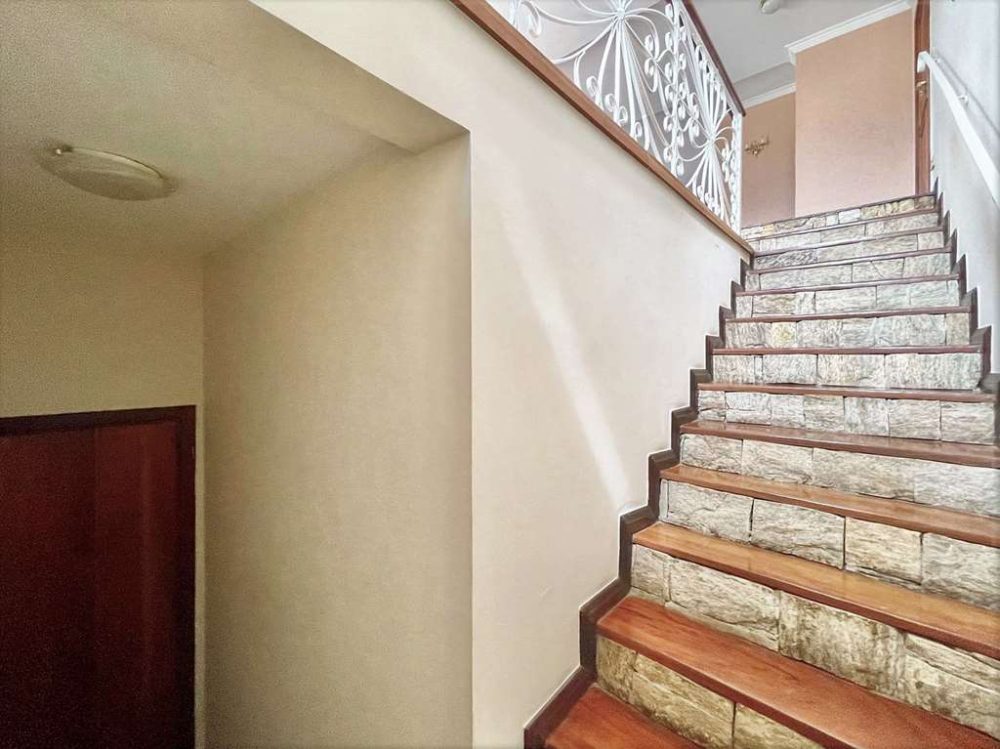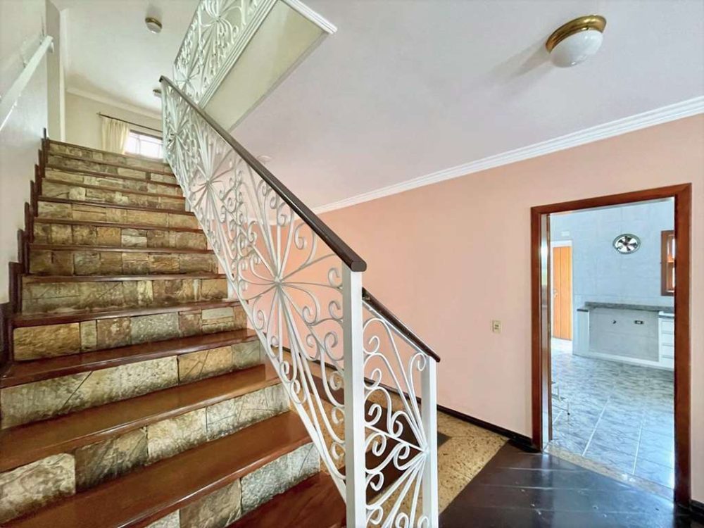 - Escadas internas com acabamento em pedra, degraus de madeira e guarda corpo em serralheria trabalhada.