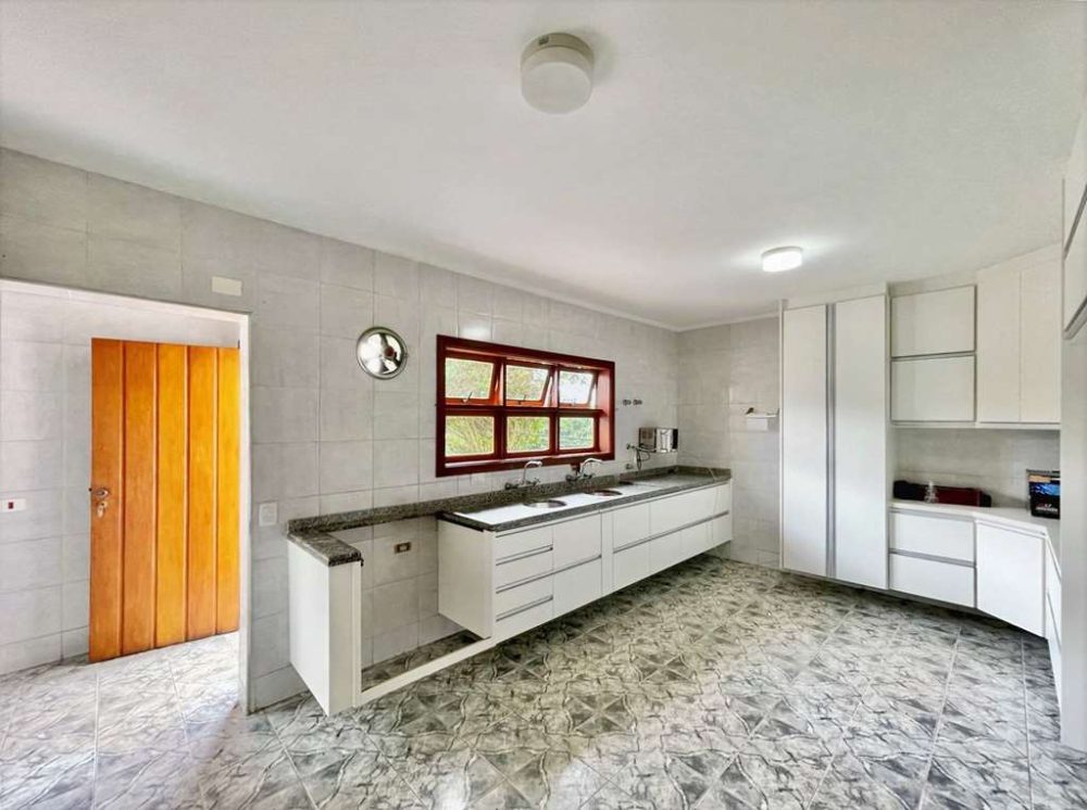 - Ampla cozinha com armários planejados e grande pia em granito com duas cubas.