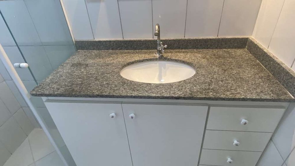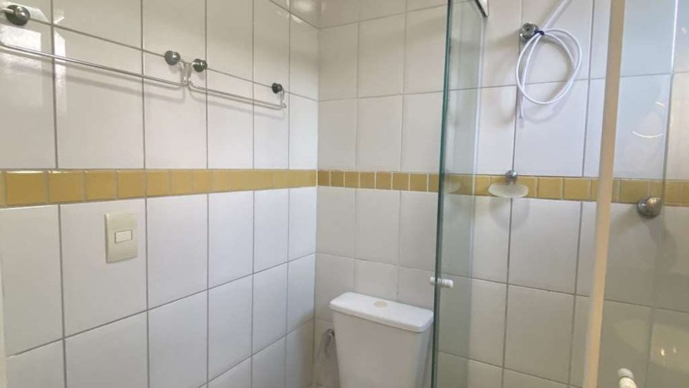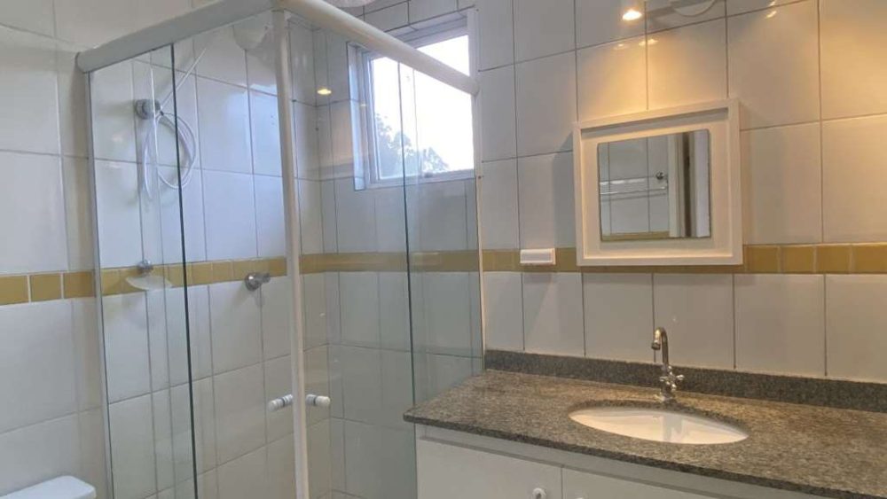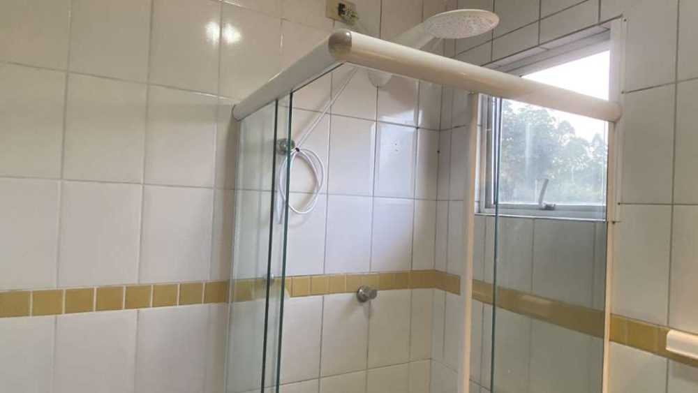 • Banheiro social com box de vidro temperado, chuveiro elétrico e gabinete