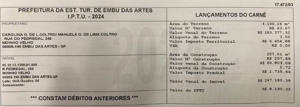 Inscrição Cadastral: 05.32.13.1360.01.000 / Embu das Artes