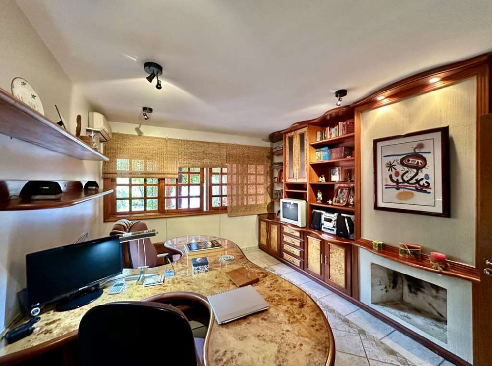 • Escritório repleto de armários, 2 estações de trabalho, lareira e ar-condicionado, voltado para a varanda e jardim.