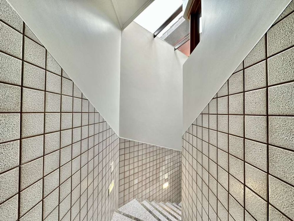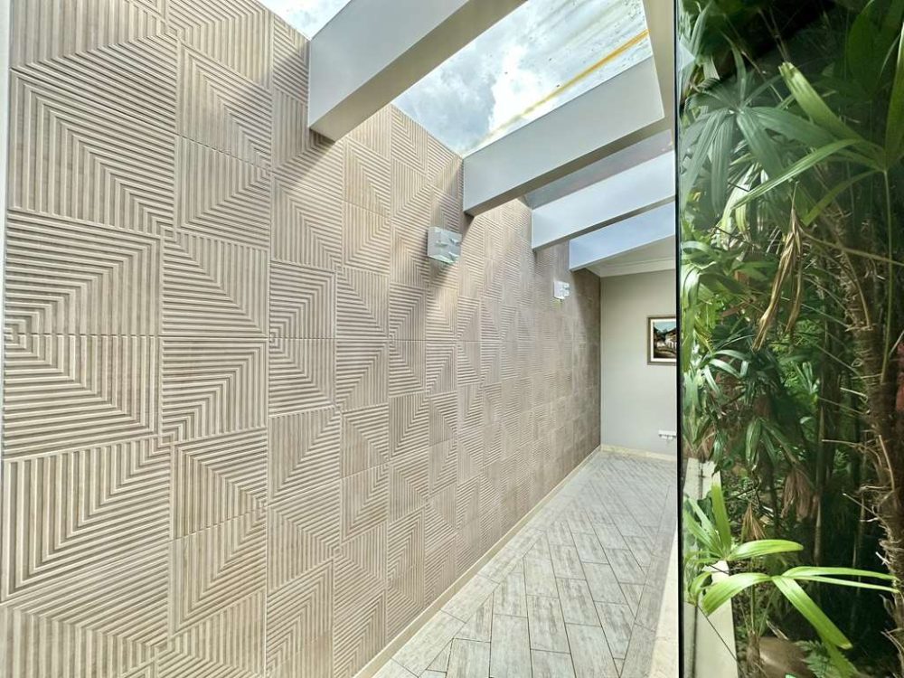 • Hall íntimo com roupeiro, parede em cerâmica 3D, jardim de inverno interno e teto de vidro.
