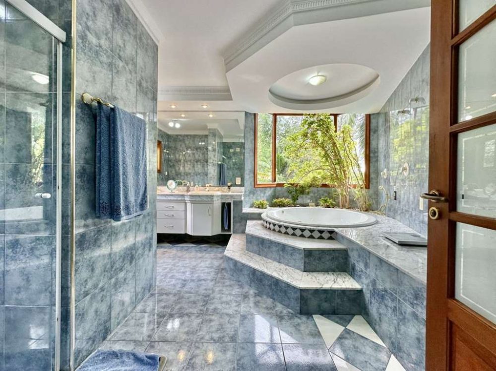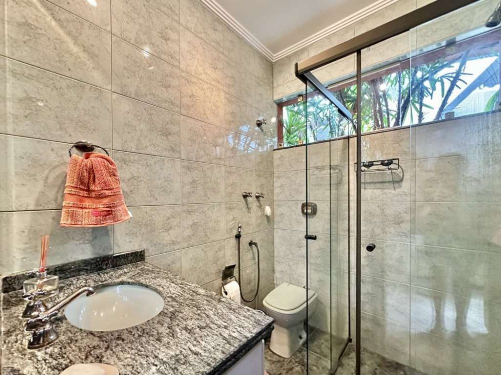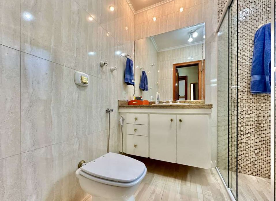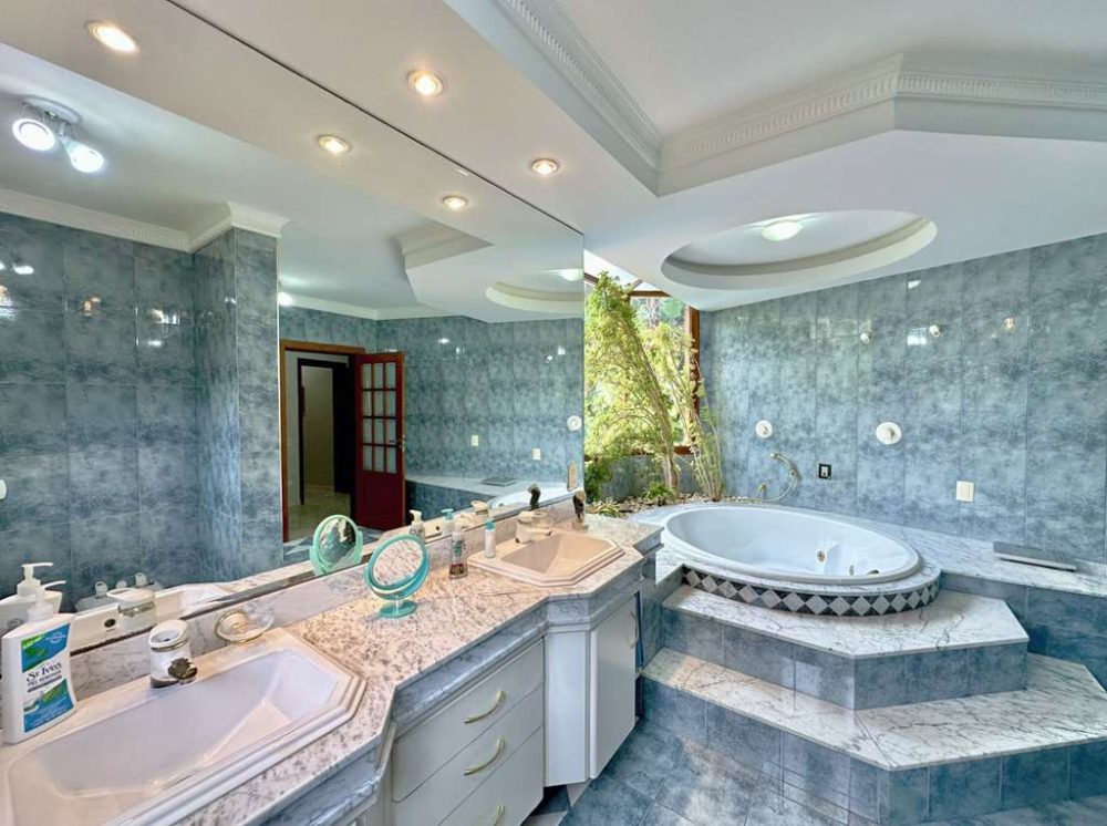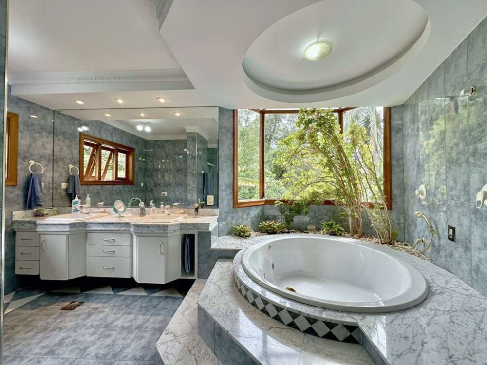 • Banheiros com tampos em granitos, espelho, gabinetes e box de vidro. Sendo a master uma sala de banho, com tampo em mármore, 2 cubas, 2 duchas e hidro redonda dupla.