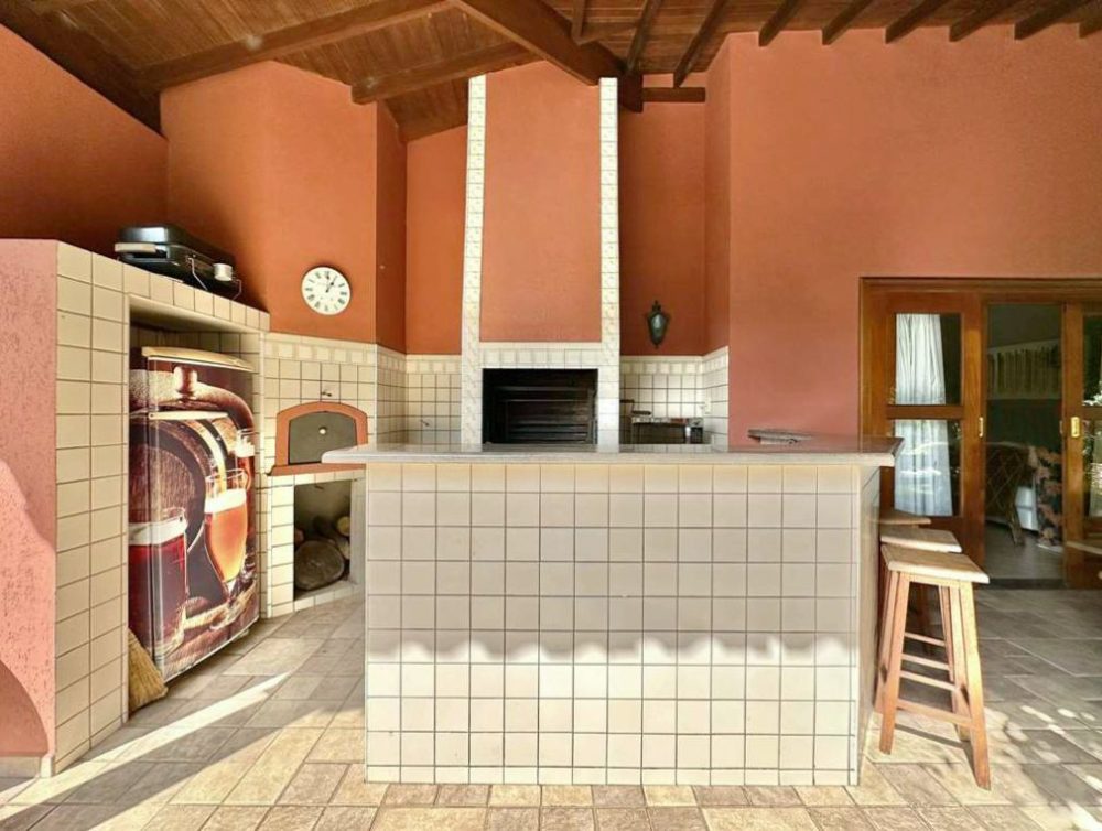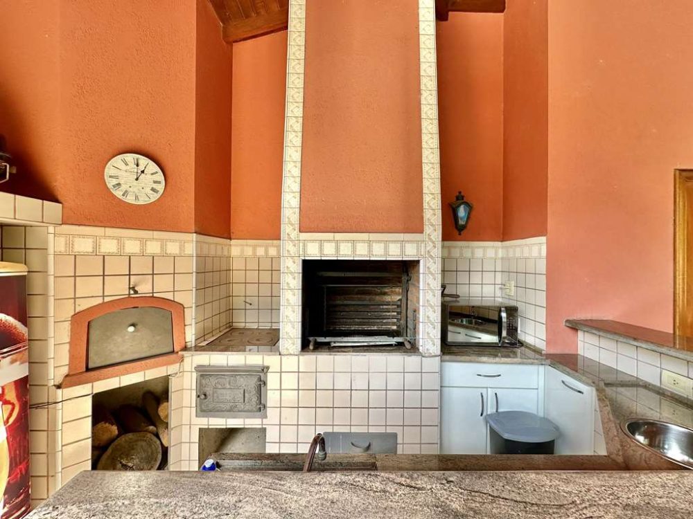 • Varanda gourmet integrada à piscina, com churrasqueira, forno de pizza, fogão à lenha, bancadas e balcão em granito, 2 cubas inox e gabinetes.